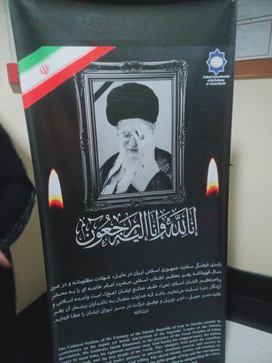 SA kabila ng matagumpay na pagdiriwang ng relasyong diplomatiko ng Islamic Republic of Iran at Pilipinas kasabay sa tagumpay ng kanilang Rebolusyong Islamiko nalulungkot naman ang maraming Muslim lalo ang mga sumusuporta sa kanilang Supreme Leader na si Ayatollah Ali Khamenei sa pagkamatay nito at ng kanyang pamilya lalo ang kanyang 14 month old na apo na pinatay ng mga zionistang Israel at United States of America sa pambobomba kamakailan.