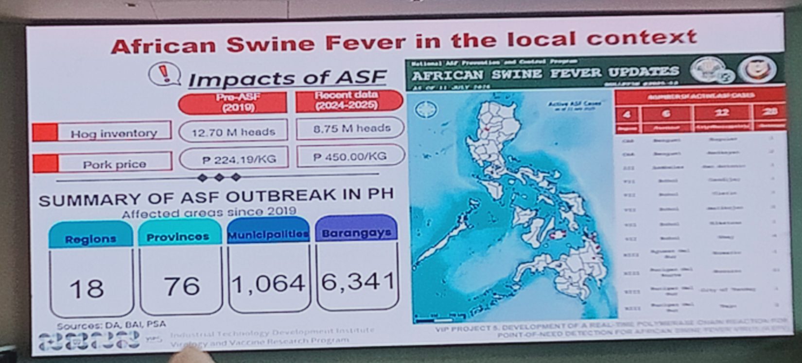 Ayon kay Dr Synan Baguio, dahil bagong virus ang ASF lahat halos ng commercial hog farms na malalaki ay naapektuhan at marami ang naging mga losses sapagkat sila ang laging naibalita sa media ngunit ang mga backyard raisers ay apektado rin at ang ASF ngayon ay nasa pandemic proportion na ngunit sa pinakaraming native pig, (anim ang breed natin ngayon) dalawang breed ang hindi na apektohan ito ang nasa Marinduque at ang nasa Benguet.